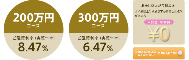 ●ご融資利率:MONEY CARD GOLD・短期プライムレート+5.0%・7.0%、MONEY CARD・15.0%(実質年率)